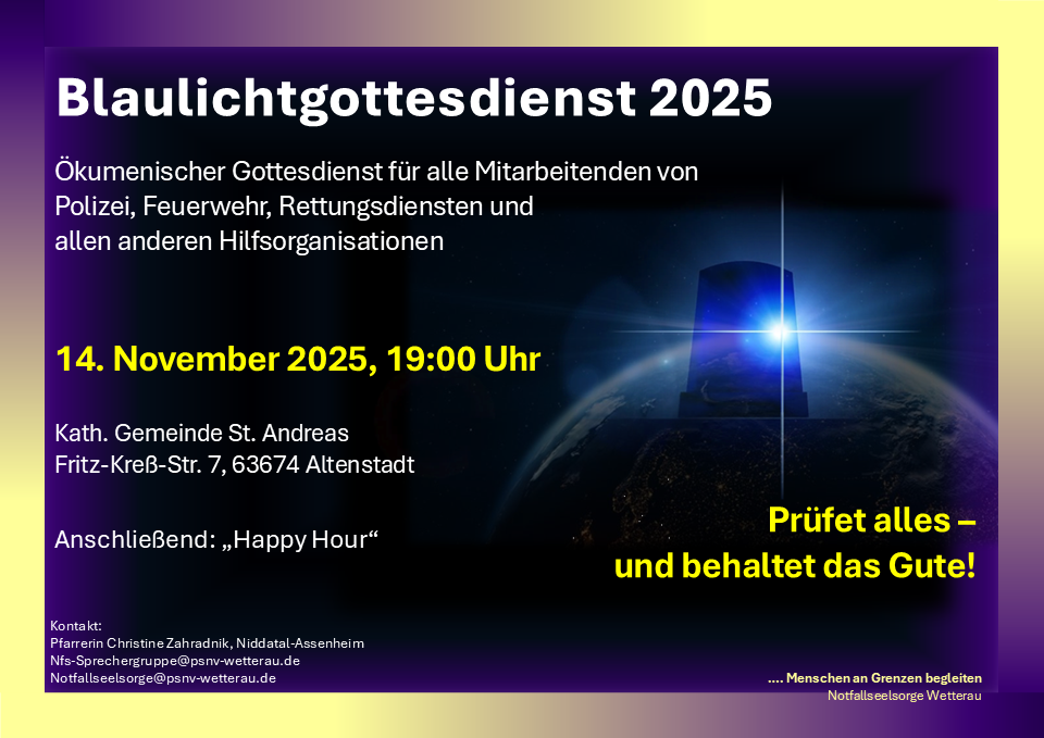 Jedes Jahr Mitte November laden wir zu einem ökumenischen Gottesdienst für und mit allen Hilfsorganisationen, der Polizei, der Feuerwehr und anderen Gästen aus unseren Einsatzgeschehen ein.